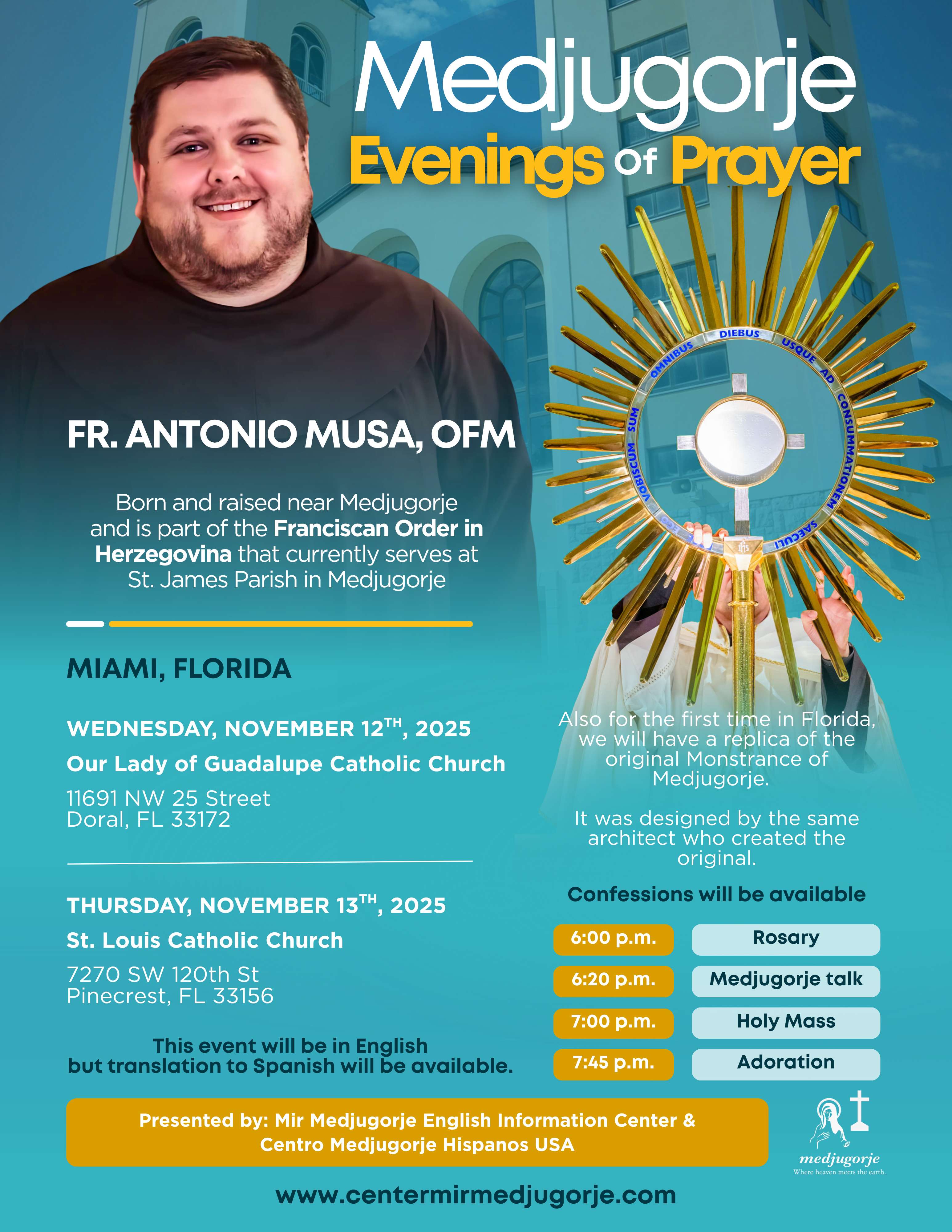 Last year, Father Zvonimir Pavicic traveled across the United States hosting these moving evenings of prayer. This year, Father Antonio Musa, OFM, a Croatian Franciscan priest from Medjugorje, will continue this beautiful mission, bringing the spirituality of Medjugorje to the heart of Miami.